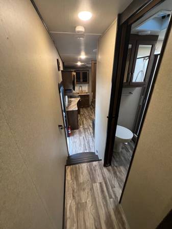 Sleeps 9! Bunk room with three bunk beds, Queen bed, Convertible sofa, U-Shape Dinette, Three burner Stove/Oven, Mid size electric/Propane refrigerator, Convection microwave, 40 in Television, Interior/Exterior speakers, Radio, Exterior Kitchen, One Slide out, 21 ft power awning, 15,000 BTU air conditioner, 6 gal electric/propane Water heater, Two 14.2 gal propane tanks, Front/Rear power leveling jacks. Holding tanks; Fresh water: 52 gal, Gray water: 78 gal, Black water: 39 gal.