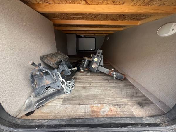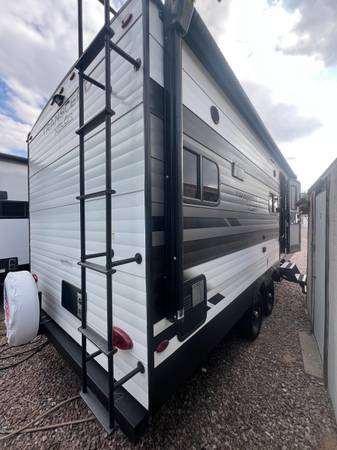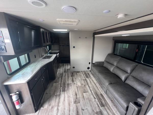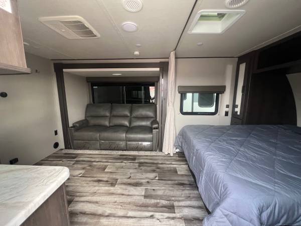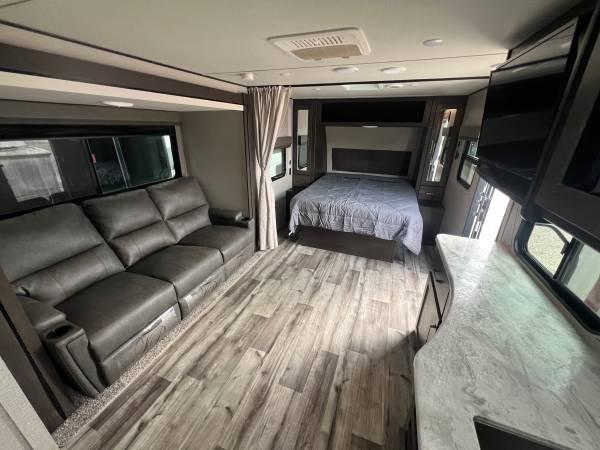 Sleeps 2, Queen bed, Theater seats, One slide out, 17 ft power awning, Front/Rear Manual leveling jacks, Three burner Stove/Oven, Mid size electric refrigerator, microwave, Solar equipped, 13,500 BTU air conditioner, 6 gal electric/propane water heater, 32 in television, Radio, interior/exterior speakers, BT capable, Back up camera. Holding Tanks; Fresh water: 62 gal, Gray water: 39 gal, Black water: 39 gal.