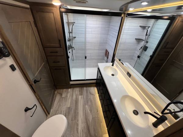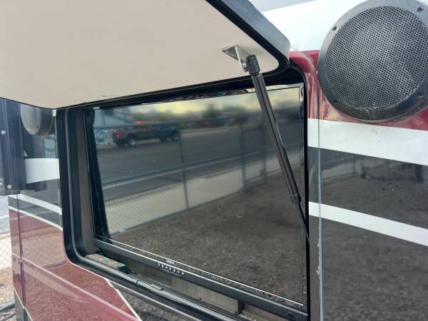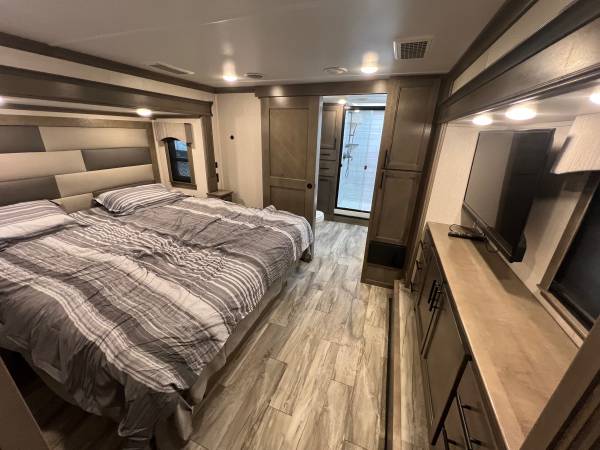 Sleeps four, Four Slide outs, 20 ft Power Awning, Front/Rear Power Leveling Jacks, Washer/Dryer, Fireplace, Two 15,000 BTU’s Air Conditioners, Four Burner Oven/Stove, Microwave, Full Electric Refrigerator, Dish Washer, Two 18.9 gal Propane Tanks, Two Bathrooms, Interior/Exterior Speakers, JBL Radio, 50 inch Television, 32 inch Television, King Bed, Tri-Fold Sofa sleeper, Theater Seats. Holding Tanks; Fresh Water: 95 gal, Gray Water: 82 gal Black Water: 82 gal.