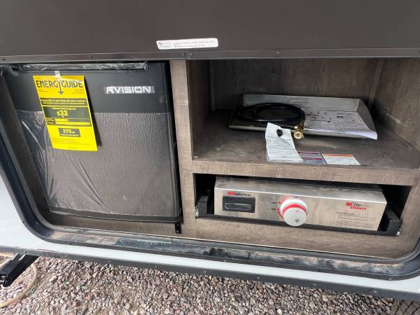 Sleeps 6, Queen bed, Bunk beds, Convertible Dinette, 24 in television, Radio, Interior/Exterior speakers, One slide out, Two burner stove, Convection microwave oven, 8 cu. ft electric/propane refrigerator, Air conditioner, 13 ft power awning, Front/Rear Leveling Jacks, Exterior shower, Exterior Kitchen, Solar ready. Holding Tanks; Fresh water: 38 gal, Gray water: 30 gal, Black water: 30 gal.