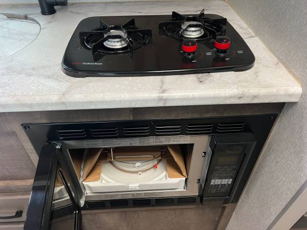 The Sonic Lite 169VUD offers a double bunk, large 65″ x 48″ dinette, a 60″ x 75″ queen bed and large dry bath. The kitchen features a 8 CU FT electric double-door refrigerator for ample food storage, 2-burner stainless steel cooktop, Convection Microwave oven, roller ball bearing drawer guides, and cabinets with mortise and tenon hardwood cabinet doors.