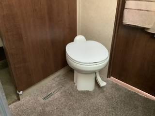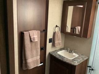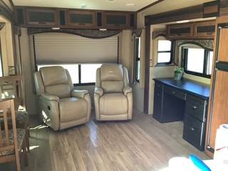 Large bedroom up front with lots of storage and closet space. Kitchen has 3-burner gas stove and small oven and microwave. Double stainless-steel sink with covers. This model has a dining table with 4 dining chairs, 2 recliner rockers and plenty of space. An entertainment center with stereo, TV and space for storage. We have added a desk for conducting business in the RV which makes it very handy for traveling workers. Lots of extras included.