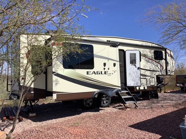 Jayco Eagle HT in excellent condition. Rear living with large open area. 3 slides with slide covers. Newer aluminum steps that fold in for security and stability. Second battery installed. Tire monitoring, MOR/RYDE ride hitch and suspension. New under belly installed