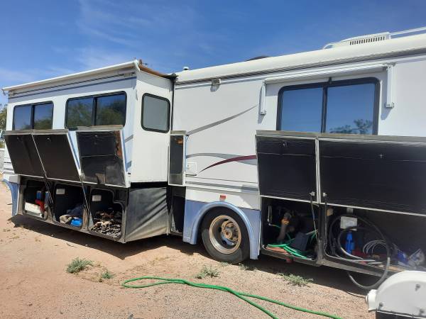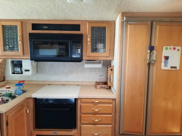 14' ELECTRIC SUPER SLIDE OUT. 20' AWNING. WINDOW AWNINGS. ALL AWNINGS ARE WRAPPED ARE COVERED TO PROTECT WHEN NOT EXTENDED. ELECTRIC OVER HYDRAULIC LEVELERS. DRIVERS DOOR. AUTOMATIC ELECTRIC STEP. 2 A/C UNITS. 2 FLAT SCREEN TVS. 30 GALLON PROPANE TANK. GENERAC 66LP GENERATOR. CONVECTION MICROWAVE OVEN. GAS STOVE WITH OVEN. DOUBLE DOOR FRIDGE WITH ICE MAKER. QUEEN BED WITH 4" FOAM TOPPER. JACK KNIFE SOFA BED. SWIVEL ROCKER RECLINER. MEGA STORAGE. 22K OR BEST OFFER.
