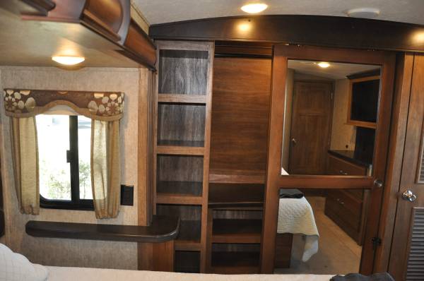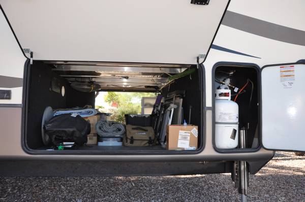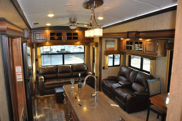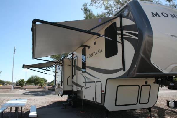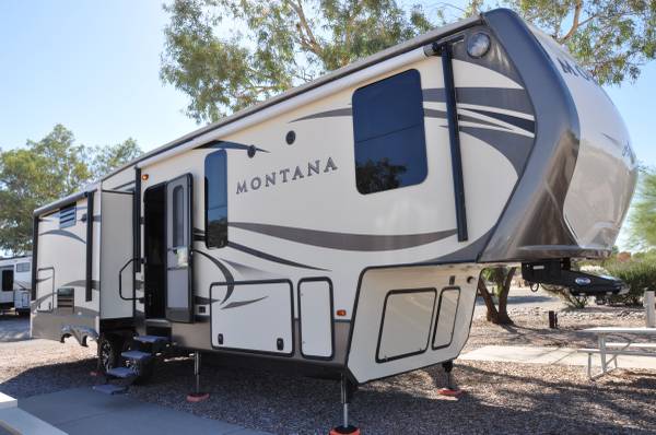 This is a beautiful 3160RL rear living unit, with 3 large slides, loaded with high end amenities. It will provide you with luxury living whether you are going for a weekend or travelling cross-country. Montana Fifth Wheel has been rated #1 in the industry for many years. This is a four-season unit with two air conditioners, heated basement storage, frameless windows, and two electric awnings for shade. It has two 7-gallon propane tanks, two 12V batteries, 12-gallon hot water heater, two 60 gallon “grey” tanks, and a 40 gallon “black” tank. Set up is a breeze with a six point auto leveling system.