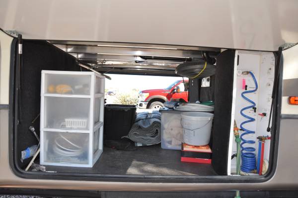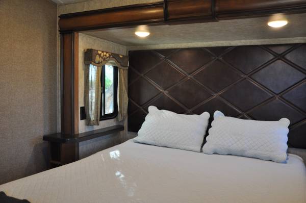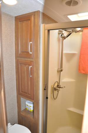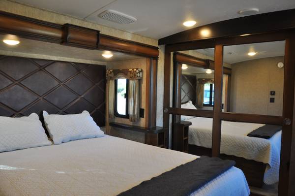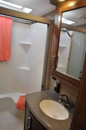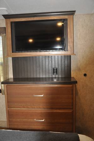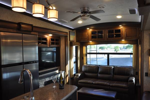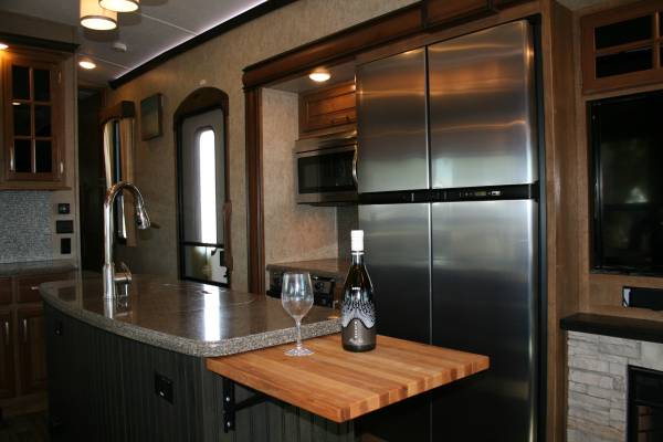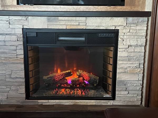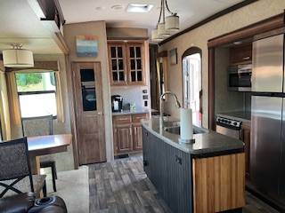 The family room includes an entertainment center with tv, radio/DVD player; electric fireplace; large fold out couch and two recliners. Enjoy a center island kitchen with a fold down cutting board extension and two stainless steel sinks. The kitchen includes a full-size French door refrigerator (Gas/Electric), microwave oven, gas stove/oven, ample cabinet space and large pantry. Spacious dining area seats five. The bathroom has a large shower, mirrored storage cabinet, with under sink storage and linen closet. There also is an outdoor TV.