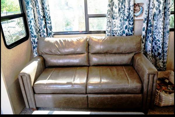 It has a BIG and Beautiful 14-foot WIDE Slide out in which the Living Area and Dining Area both are in the 14 foot of Slide out. It comes with a big Kitchen Double sink with 2 large Stainless Steel Kitchen Sinks and a 3 burner Stove that has a Glass top and a large Oven and a microwave. It also comes with a new Wireless Trailer Tire Air Pressure Monitoring System.