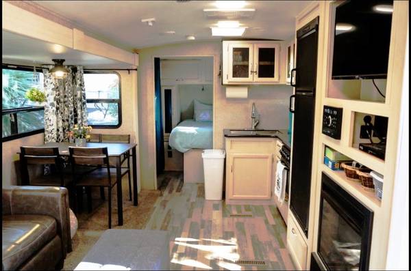 It rides and tows very easy. A few of my favorite things are: This trailer has tons of outstanding amount Under the Master Bed storage plus more storage everywhere and has a bump out sky light for more height. The dining area has been UPGRADED by the previous owner from a dining booth to a free-standing dining table with 4 cushioned chairs. He also had newly upgraded plumbing fixtures and hardware installed in both the Kitchen and Bathroom.