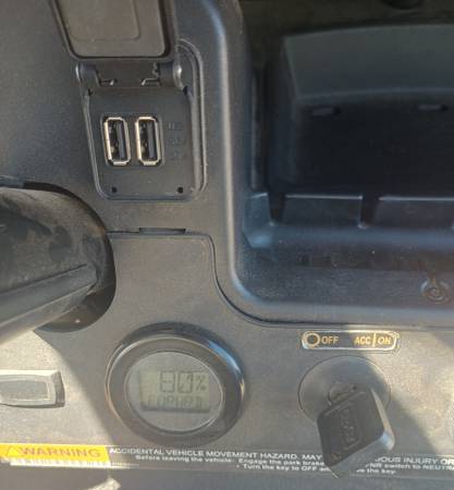Has a Folding Windshield, Headlights, Taillights, Hazzard lights, Cup Holders and cubby holes, USB Port, Alloy Wheels, Battery Charger, lithium Battery.