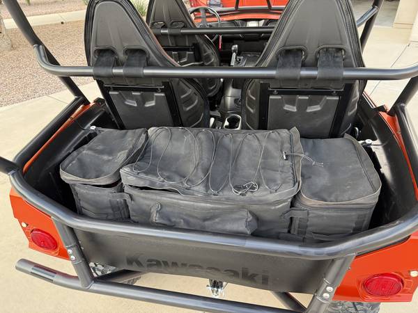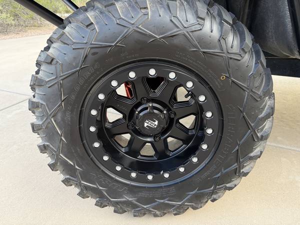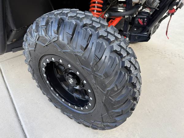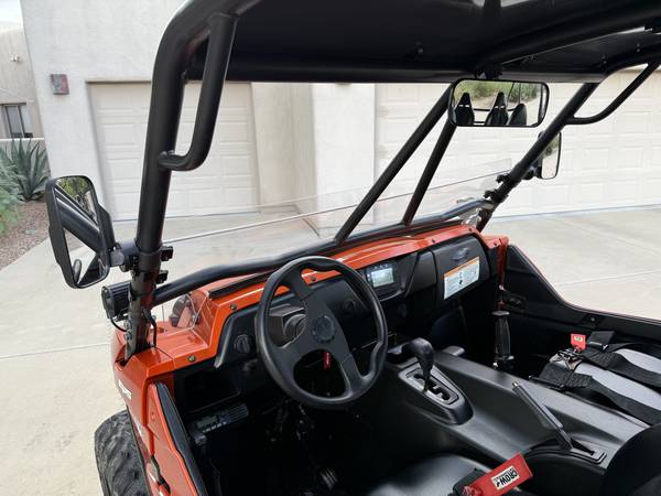 This SxS is in great shape with many upgrades. Long Travel Roll Cage with aluminum roof and Rear Bumper; Long Travel Front Bumper; Winch mounted to front bumper with remote; A Pillar Pod lights and 12 inch Front Light Bar; Kenwood 2-way Radio with Foldable Antenna; 4 Point Crow Seatbelts with seat modifications on all four seats; Adjustable/sliding driver’s seat; OEM Half Windshield; Like new Tusk Uinta Matte Black Wheels and 28x10-R14 Tusk Aramid Terrabite tires (been on for only two rides); 2 LED Dome Lights with on/off button; LED Reverse Lights; Clip in modular soft storage bags for cargo area; Remote battery switch with removable key; Rearview mirror and side mirrors; extra maintenance items (Engine oil, driveline gear oil, drive belt, belt changing tool, extra foam air filter, tire lug key); New battery; Storage cover; SxS approx. dimensions 74-1/2” Tall, 60” Wide, 131” -133” Long.