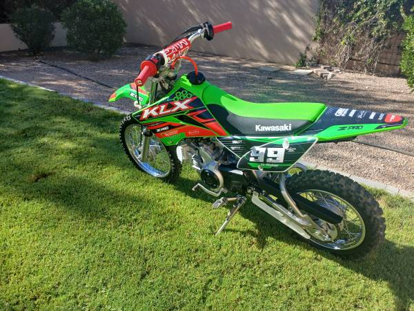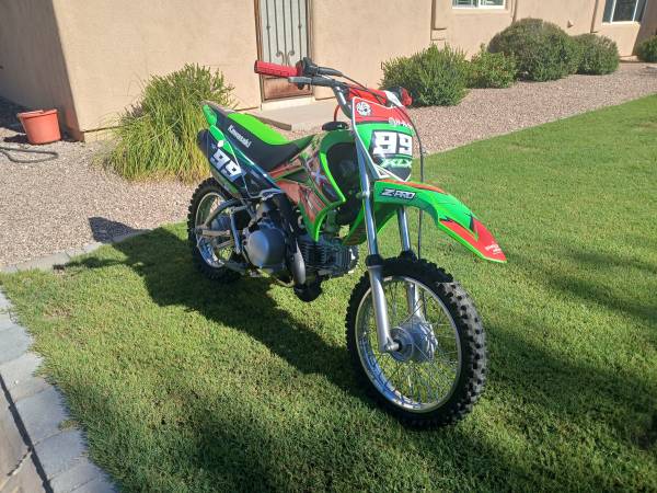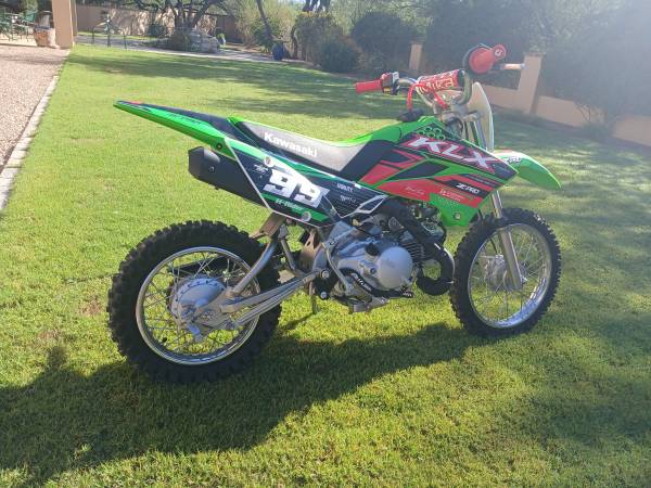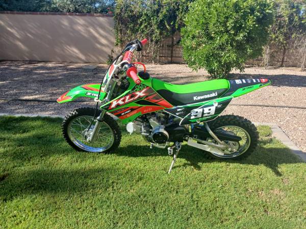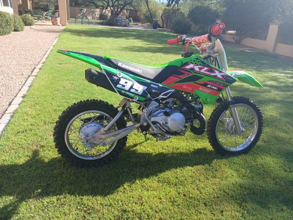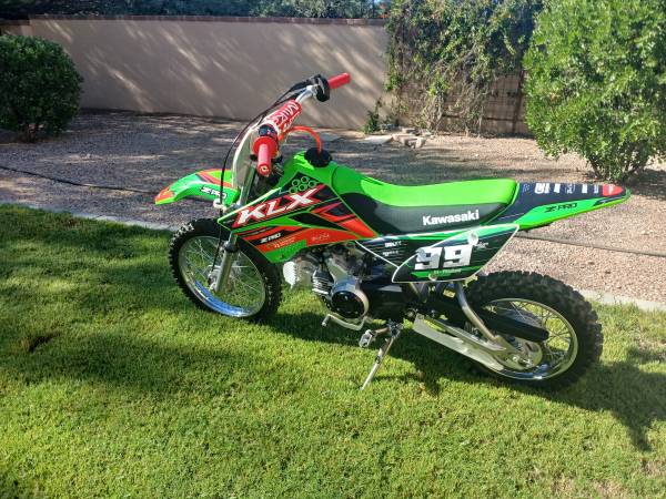 This is an absolutely immaculate, one owner low use, brand new Kawasaki. KLX110. The bike is bone stock, with the exception of a few tasteful upgrades, including graphics, aftermarket over the peg brake lever that eliminates the under the peg lever. Also has the neutral start eliminator which allows you to start the bike in any gear. I do have the stock switch in case you want to return it to starting only in neutral. I also have the factory owners manual and a spare twin air filter. The bike has a clean and clear title It also has brand new front and rear tires. Pickup in Northeast Tucson.