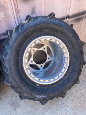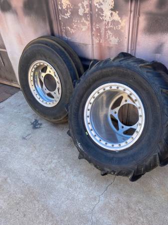 Rear wheels are Douglas billet bead lock-with 12 paddle eliminator by extreme tire 14.50 15 and front wheels are also Douglas billet bead lock with razorback by sand tires Unlimited 8.50 x 15 both front and back wheels have big five bolt pattern 5 on 205mm
