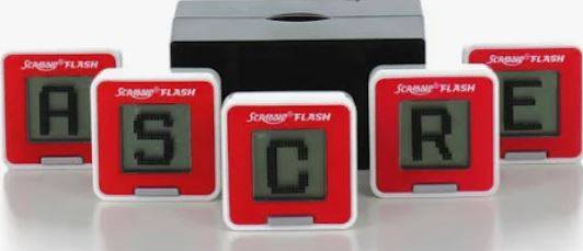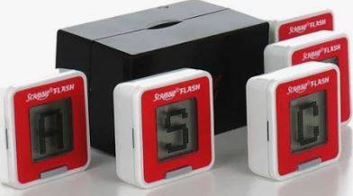 HASBRO TOYS ELECTRONIC SCRABBLE FLASH GAME - 5 TILES Scrabble game, five tiles that display letters and link together to spell words. Case and instructions included. Good gift for child learning to...