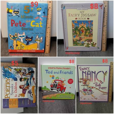 Scroll to See all pictures for prices and information. Lots of kids Hardcoverbooks. Some contain puzzles, some cds, flip pages. All in excellent condition.
