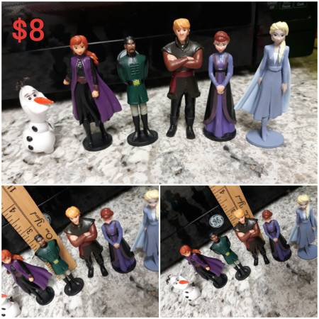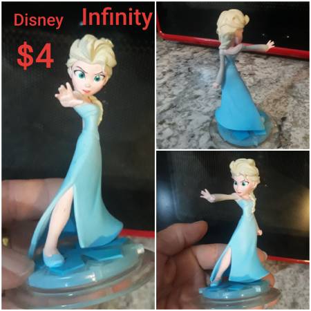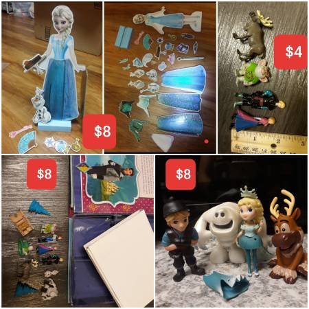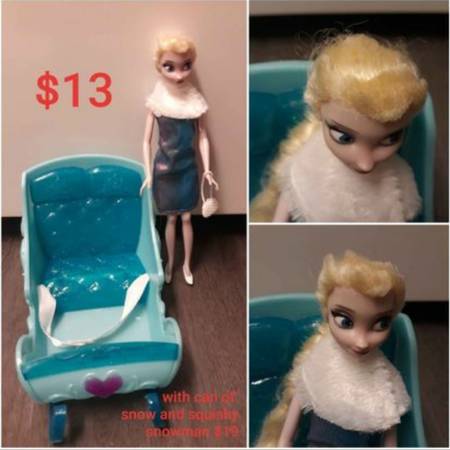 Instant snow(1 gallon)$8. Instant snow with build your snowman kit $8. Instant snow $5. Instant snow with gel balls and food color tablets bundle $8. Sleigh with barbie elsa $13(add squishy snowman and can of snow $6). Sleigh with singing elsa $18(add can of snow and squishy snow man or make your own snowman $6 and $8. Light up and sing elsa doll $12. Squishy snowman $1. Innotab v-tech $3. Leapfrog cartridge $6. Watch $3. Wood dress up doll set $8. Large cards $2 each. Large cards game in tin box $4. Busy book with figures(no elsa)$8. Four mini figure only $4. Four piece figures $8. Infinity game piece Elsa $4. Olaf 17"backpack with pocket $10. Elsa 16"(No shoes. No batteries)$18. See all pictures for prices.