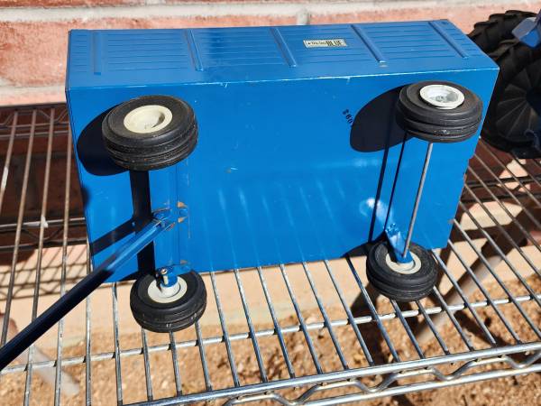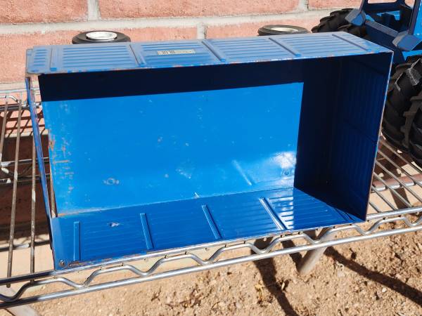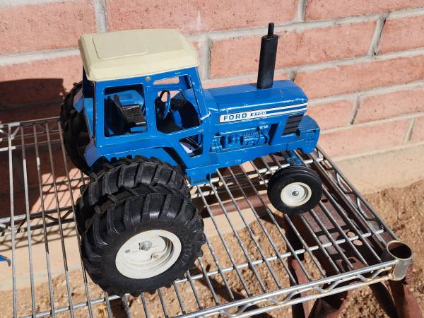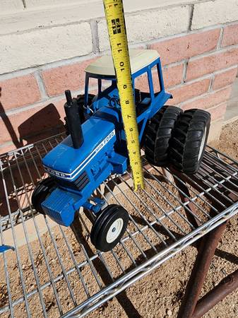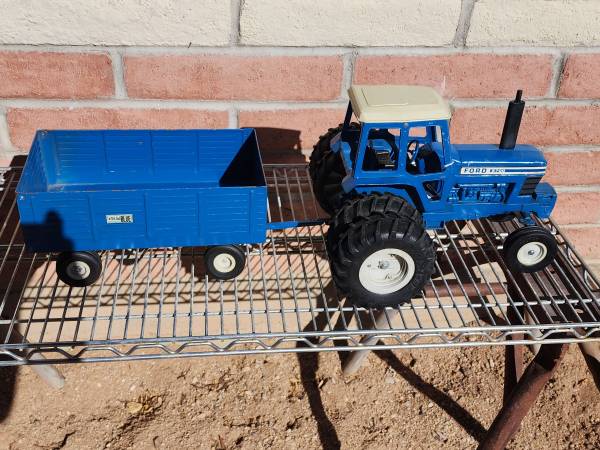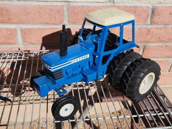 1/12 Scale, Ertl Brand Ford 9700 Blue tractor. 14" long. Nice over-all condition in played with condition. It comes with BIig Blue 12" Hay Wagon. $100. Calls or texts to