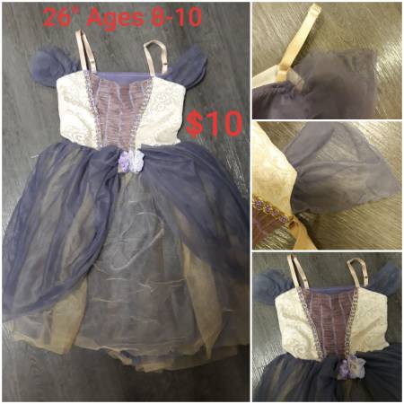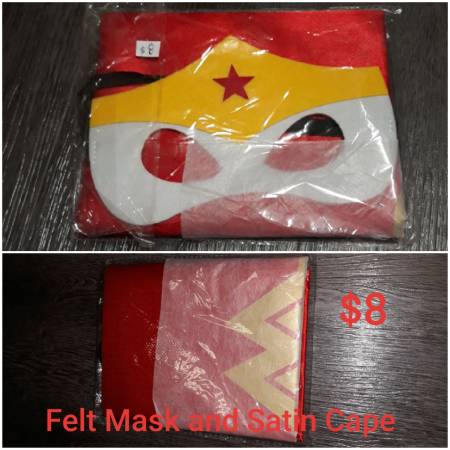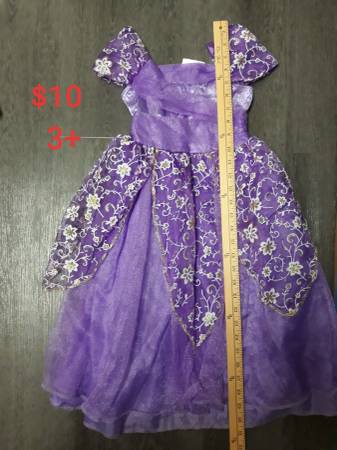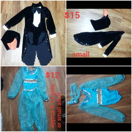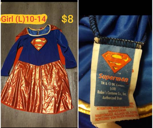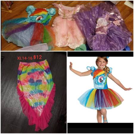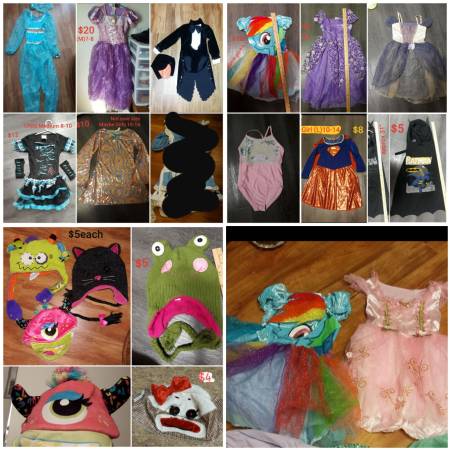 Rubies glitter fairies 3t- 4t( loose thread on back collar and loose string on front chest)$5.(SEE PICTURES). My little pony small 4-6 $10. Like new:Girls genie costum( looks like size 9-14 in girl or adult small )$12. Rapunzel 7-8 $20. Velvety Penguin outfit,small in girls or boys $15. Superwomen L/10-14 $8. Children Batman cape $5. Funny hats $5each. Monkey sock hat $4. Felt mask and Satin Cape $8. Tulle Cape, Tiara and wand $5. And more... See All Pictures for Prices and info.