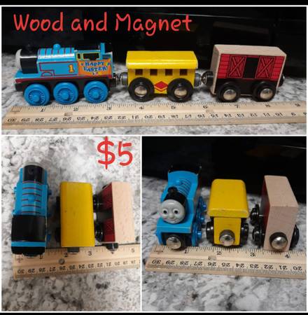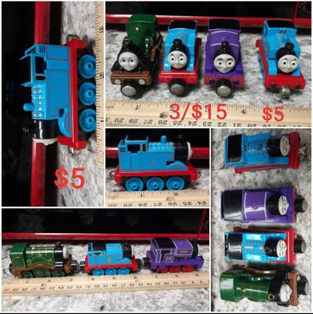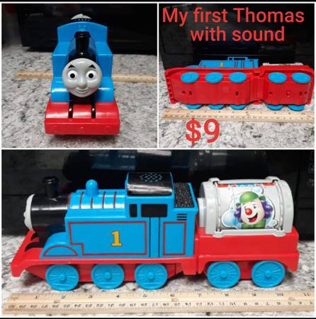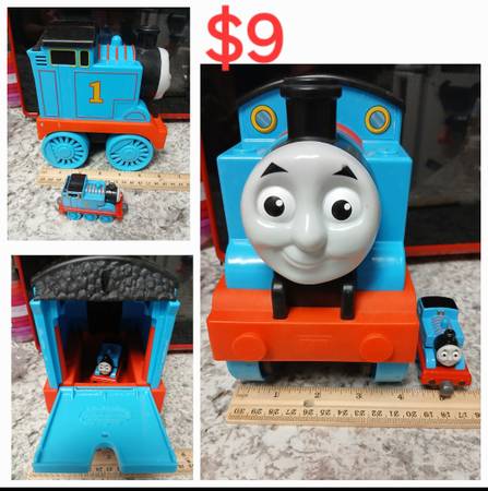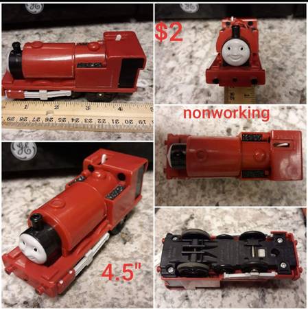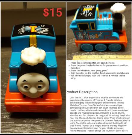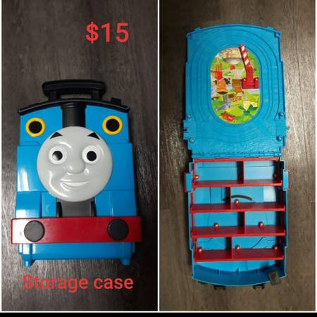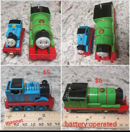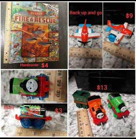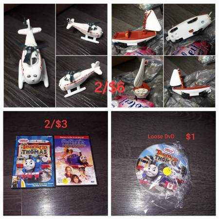 See all pictures for prices and info. Excellent condition,unless noted. Two dvds $3. One dvd(no case)$1. My first Thomas The Train Engine Rolling Melodies Musical Train $15. Thomas "minis" train case $12. Mini Trains 2/$6. Magnetic Trains 3/$15. Thomas magnetic Train $5. Mini green train $3. Thomas blue 4.5"battery operated(Uses 2AAA)$7. Green 4.5" train $6. Thomas 4.5"(battery operated)with damage stack $4. Small Thomas blue $4- $5. Non-working:Two piece trackmaster nonworking(manuel play only)$4. Brown 4.5"nonworking $2. Magnetic 4 piece $5. Small thomas $5. Green $6. Free Track with two train or a one case purchase. Disney "Planes" Jan Kowalski diecast $10. "Planes" Dvd $4. "Planes" Book $4. And much more. Batteries not included.