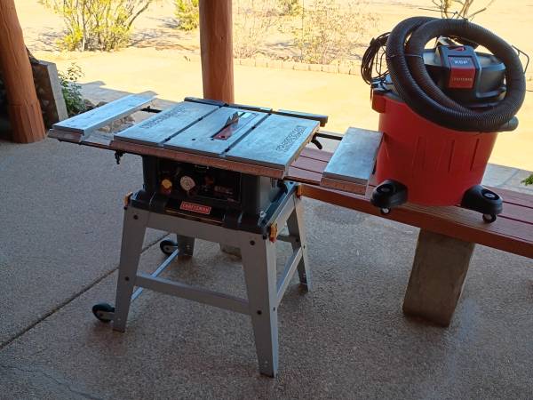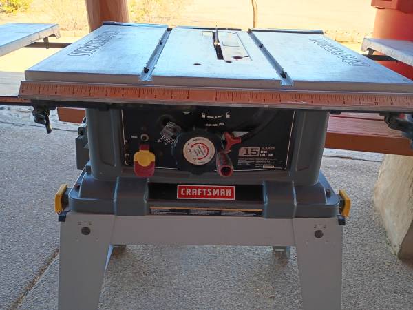 1) CRAFTSMAN 15 amp, 10", 3" Cut, 90 degree Blade Tilt, Extension Table Arms, H.D. Steel Base with Rolling Wheels. Recently Serviced.
