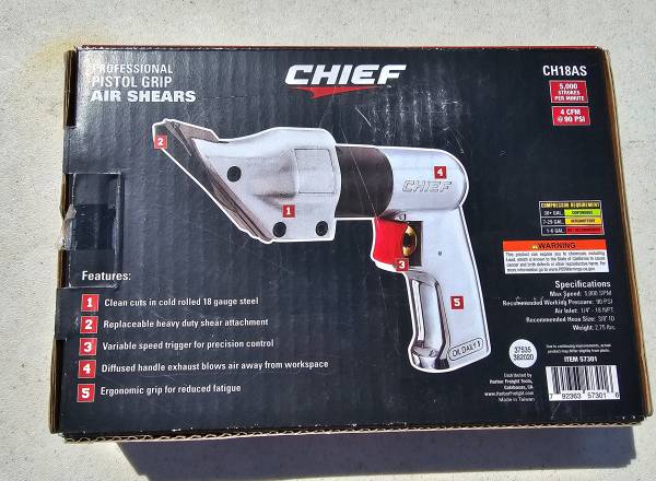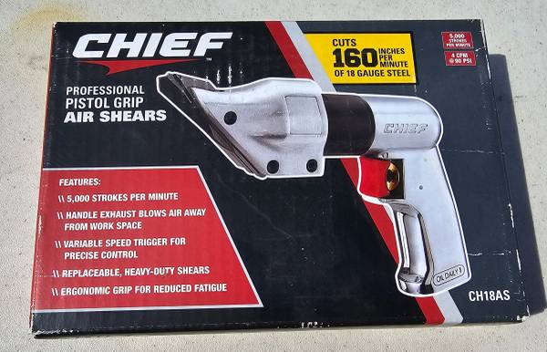 With a 360 degree swivel head, CHIEF™ Professional Pistol Grip Air Shears can cut curves and angles as well as make precise straight cuts. The specialized triple blade delivers clean cuts with minimal edge distortion, making these pneumatic shears an ideal choice for all types of fabrication. The comfortable pistol grip gives full control when cutting sheet metal, aluminum or plastic.