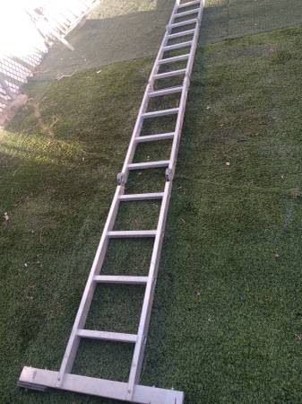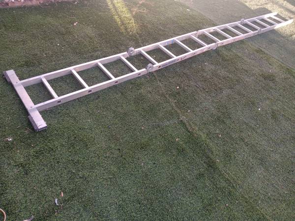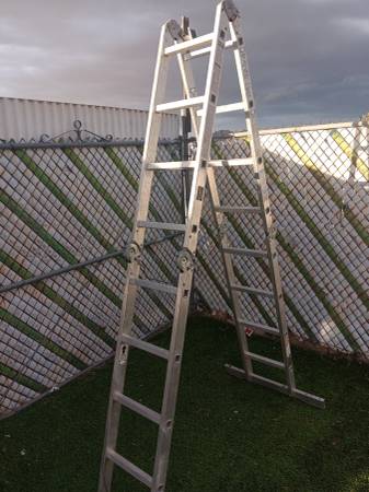 16 ft Heavy Duty folding aluminum ladder. It can be used longways as a single ladder or as an 8 ft double ladder. This is a heavy, well built one. $100 firm thanks Text