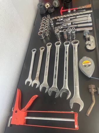 Drop forged wrenches big size 1/2 “ drive sockets 1/2 drive ratchets breaker bar 3/8” ratchet also 1/2 “ short an long extension universal socket fittings caulking gun chock string small propane torch door hole cutters small tubing cutter everything you see in add