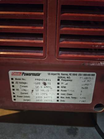 Good condition Coleman powermate gas generator Briggs and Stratton, just serviced, 1850 watt dual outlet, starts immediately. Low hours, low oil shutoff. On wheels or can lift one-handed. Call email...