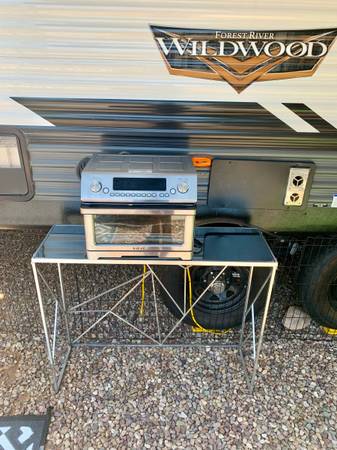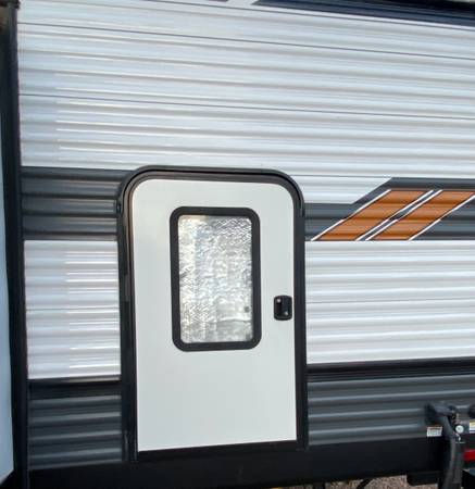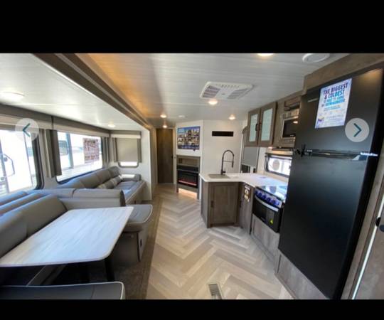 All owner's manuals and remotes come with trailer along with storage bins for storage, hose for sewer, and electric cord (50 AMP) 2 smart tv's with remotes come with the RV, it also has a sound system with remote it plays inside and outside, fireplace with remote that lights up with lots of different modes, small fridge and gas grill located outside, Awning is in perfect shape and is electric, I also have levels and a few other miscellaneous RV attachments you may find useful.