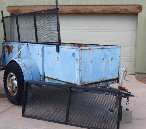 Selling this group of 3 Trailers altogether. The Blue Trailer is made from military parts and is a sturdy steel beast. It has an Atwood tongue and measures approx. 5ft x10ft (plus tongue) and is made from a Military grade pumpkin and Military Truck axle, and the steel thickness on this is amazing (over 3/16") heavy gauge. It is still super straight no rustthrough holes, and the tailgate is even still in perfect alignment and opens and closes snugly. This one does need new tires though, and would not recommend towing it with current tires. Was hoping to add the painted black expanded metal sides to this or the brown trailer for increased landscaping trailer hauling capacity but never got around to it. There's probably 1.5 sheets of heavy gauge expanded metal in this side rails and this material sells for over $150 per sheet, plus the angle iron. So a great headstart on extending the sides of this trailer or your own. The Blue Trailer is homemade, was never titled, and does not come with an AZ Plate. Although it is homemade, it has very straightforward design, and with proper wiring and lights should have no problems getting it inspected and titled as homemade trailer. I have a new tongue jack that is included with this.