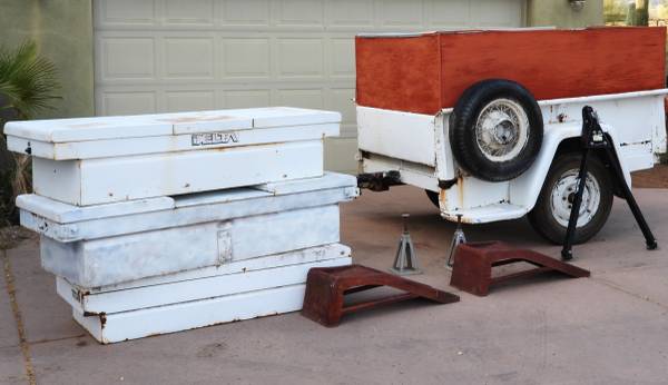 Lot of 3 Homemade Military and Truck Bed Trailers + Like New Expanded Metal Side Extensions + 3 Truck Toolboxes, Ramps, Stands, Extra Tow Bar.