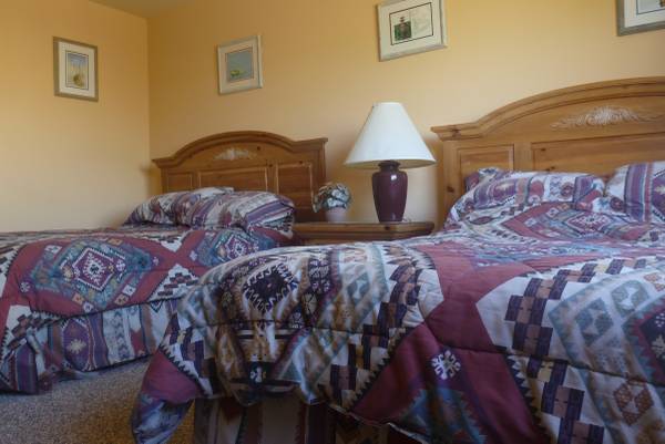 Located high above the city of Tucson, in the Tucson Mountains, a fully furnished Santa Fe-style double suite casita. Luxury lodging in a serene desert atmosphere. Bird watcher's paradise. Convenient to downtown and the University. Perfect for those who want to settle in and relax with comfortable furniture, cable TV, and Internet access. Located one mile easy walk OR free shuttle (from the nearby renovated Starr Pass Clubhouse) to the Marriott Starr Pass Hotel. Master suite with king bed, walk-in shower, two sinks. Second bedroom with two double beds and full bath. Living room with TV and cable. Patio with mountain views. Plenty of parking but not close to the unit. Heat and A/C. Fully functional kitchen. Fully furnished. Utilities and Internet included.