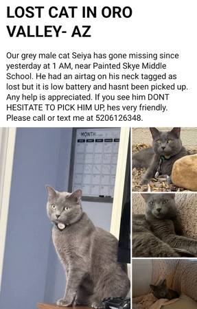 Our grey male cat Seiya has gone missing since yesterday at 1 AM, near Painted Skye Middle School. He had an airtag on his neck tagged as lost but it is low battery and hasnt been picked up. Any help is appreciated. If you see him DONT HESITATE TO PICK HIM UP, hes very friendly. Please call or text me at show contact info