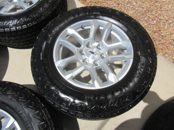 Set of New 2025 Chevrolet Silverado 1500 Tahoe oem 18 inch wheels and 265/65/18 114t Goodyear Wrangler Territory A/T tires with only 25 miles. Call show contact info